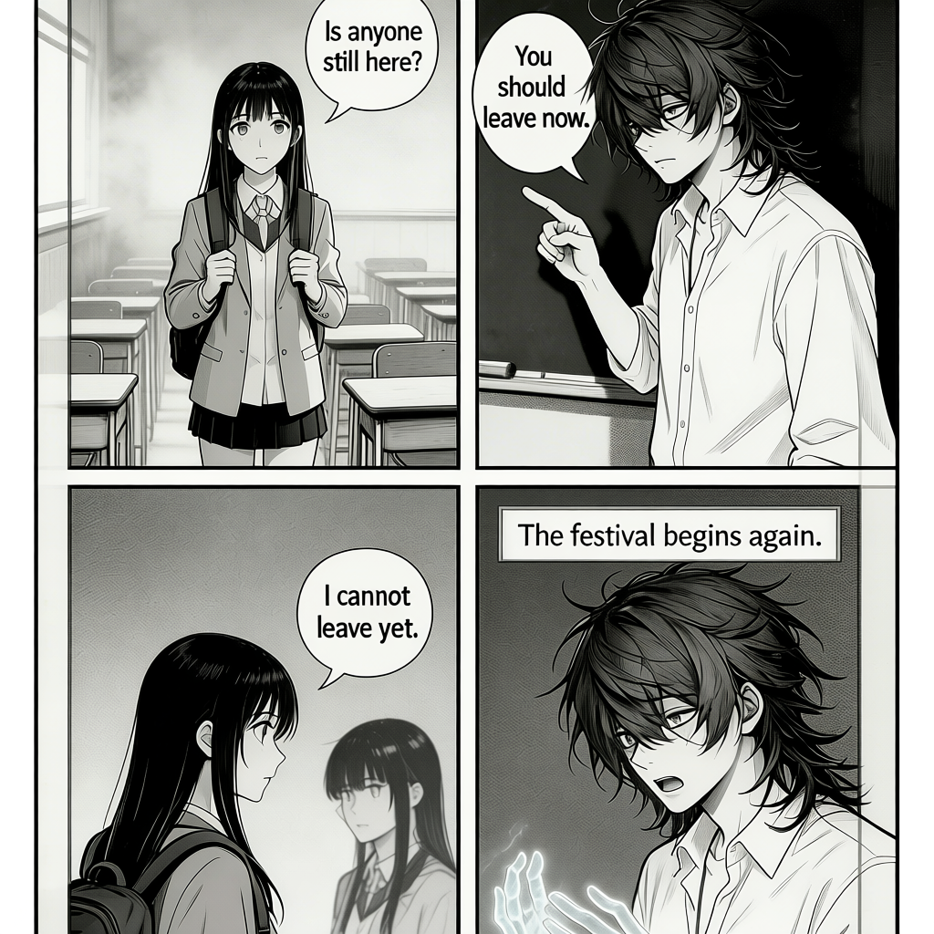 A transfer student arrives at an old hilltop school and discovers every classmate is a ghost repeating the same semester forever. The only one who can touch her is a quiet boy with no memory of how he died. To free the school, they must uncover the murder hidden beneath its final school festival. Render it in a moody supernatural school-anime style with soft fog, eerie classroom lighting, and melancholic character acting.