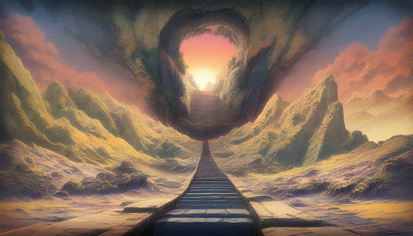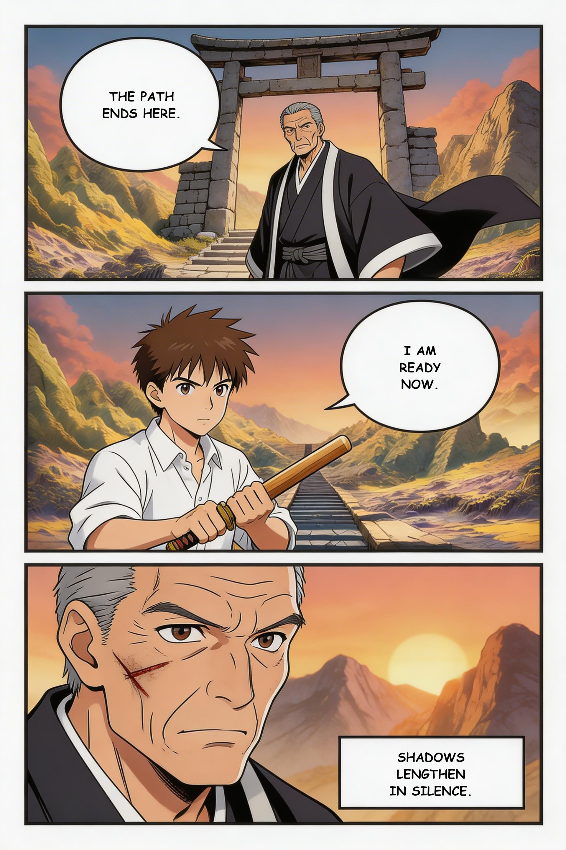 An old ronin and his young apprentice stand at a ruined mountain gate at sunset. The ronin holds his katana low, eyes closed. The apprentice watches from behind, gripping a wooden sword. Dark ink manga style.