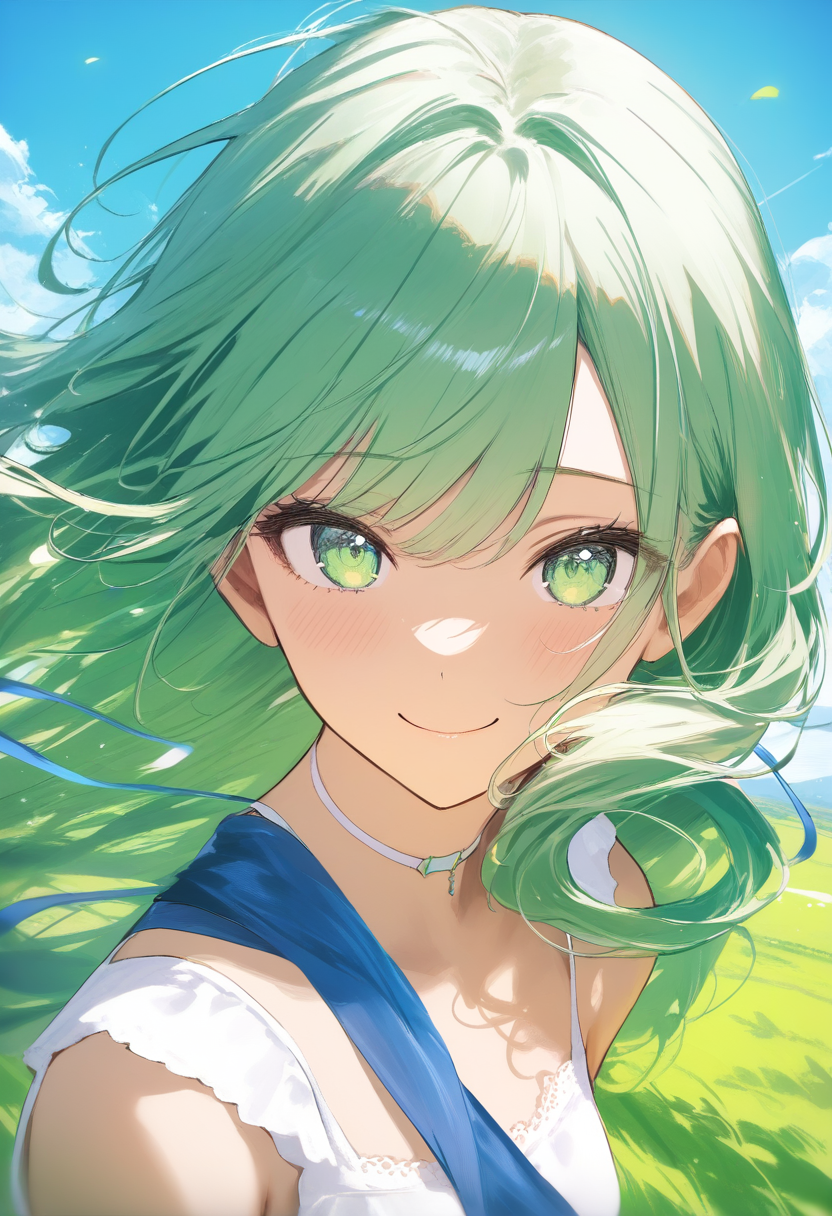 A teenage girl with long, flowing lavender hair and bright emerald eyes, wearing a white summer sundress with a blue ribbon sash. She stands in a lush green meadow under a clear blue sky, looking toward the viewer with a soft, cheerful expression.