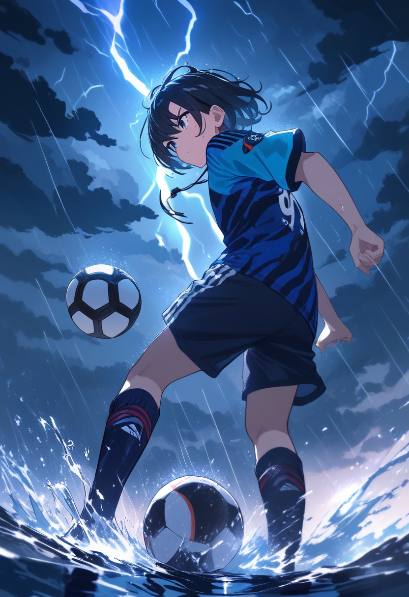 A determined soccer player in a mud-stained athletic kit sprints across a rain-slicked field during a fierce thunderstorm. His damp hair clings to his forehead as he maneuvers a ball through heavy puddles, set against a backdrop of dark clouds and flashes of lightning.