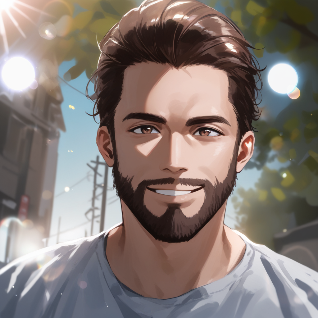 An anime-style man with neatly swept-back dark brown hair and a well-groomed beard, smiling warmly with kind brown eyes. He wears a simple grey crew-neck t-shirt and stands against a soft, sunlit outdoor background.